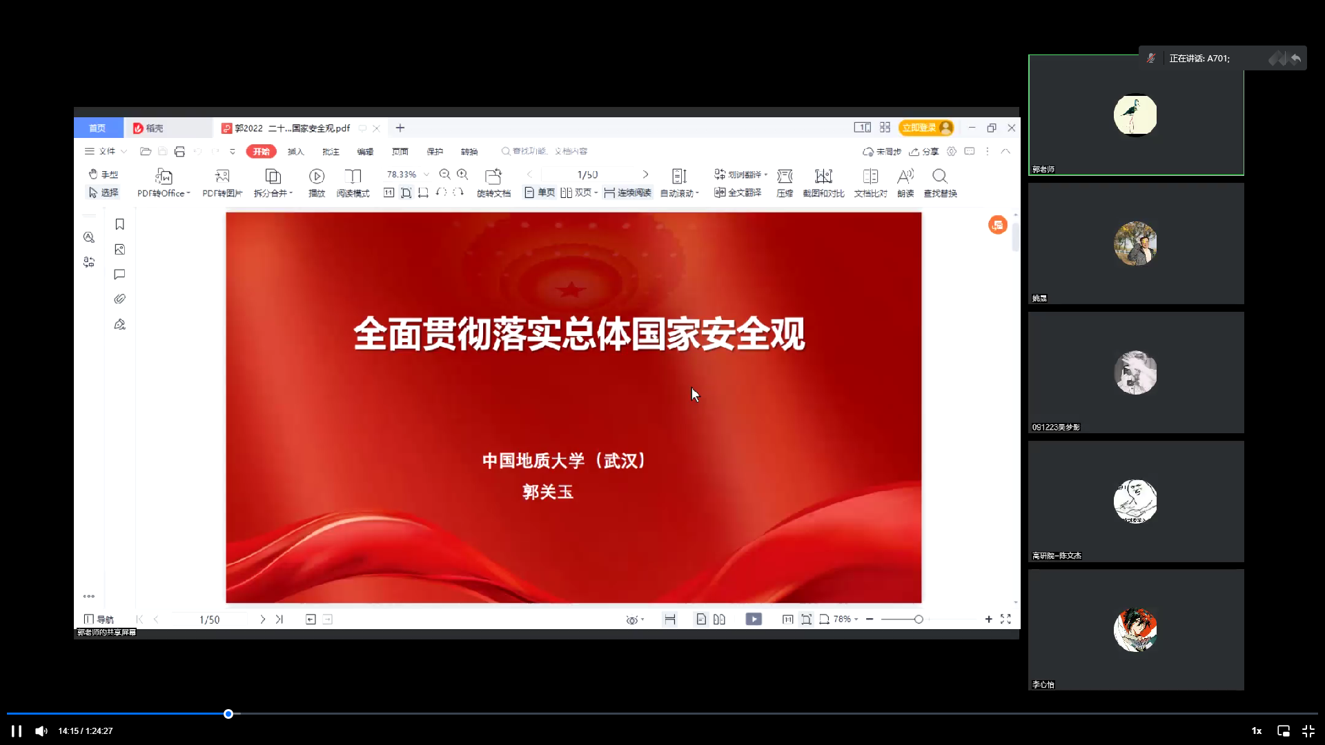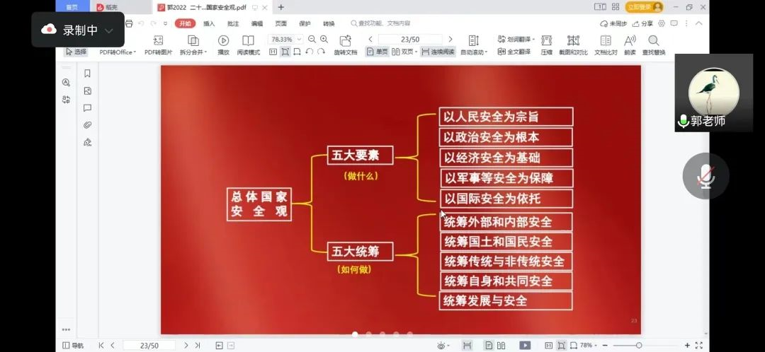 首先,郭老师点明贯彻落实总体国家安全观的主要观点——“保证国家安全是头等大事”,说明了为什么我们一定要坚持并践行总体国家安全观、坚持总体国家安全观的重要性和必要性。郭老师表示:“安全是发展的基础,国泰民安是人民群众最基本、最普遍的愿望,党中央始终高度重视国家安全,并且新发展阶段国家安全面临着多种考验。因此,青年一代必须坚持总体国家安全观,坚持党中央对国家安全提出的各项方针与政策,如党的十九大提出的‘国家安全是安邦定国的重要基石,维护国家安全是全国各族人民根本利益所在’等。