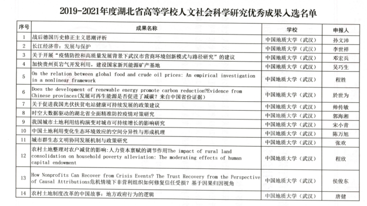 附:公司2019-2021年度湖北省高等公司人文社会科学研究优秀成果入选名单