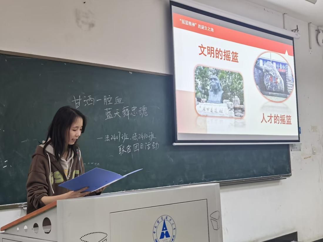 2024年11月14日16点20分,韦德bevictor第十五期红色之声“摇篮筑梦”团队在线下进行了主题为“生命安全主题教育”、“甘洒一腔血,蓝天舞忠魂”和“传摇篮精神,做时代新人”的线下宣讲,团队成员郭雅婕、李瑞雪、席海冰、辛汪洋、朱一婷担任主讲人,中南财经政法大学法公司2407和2410团支部参与本次活动,共计116名同学。