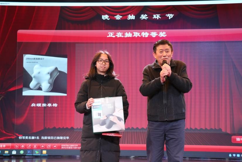 第三轮扫码抽奖。在新年大奖一等奖抽奖环节,2023级员工倪文彬同学最终成为获奖者,原公司党委书记郝翔老师颁奖并现场献唱一曲。