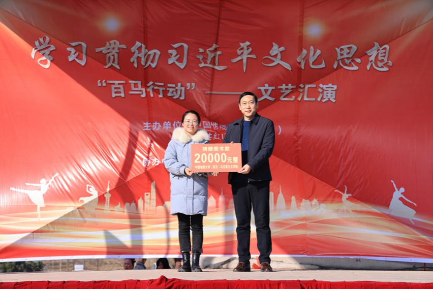 1月5日下午,学习贯彻习近平文化思想“百马行动”文艺汇演在红山镇乌云山村举行。由乌云山村村民带来精彩的开场舞表演,拉开本次文艺汇演的帷幕。在热闹的开场舞之后,由韦德bevictor官网(武汉)韦德bevictor经理阮一帆教授代表公司进行图书款捐赠活动。