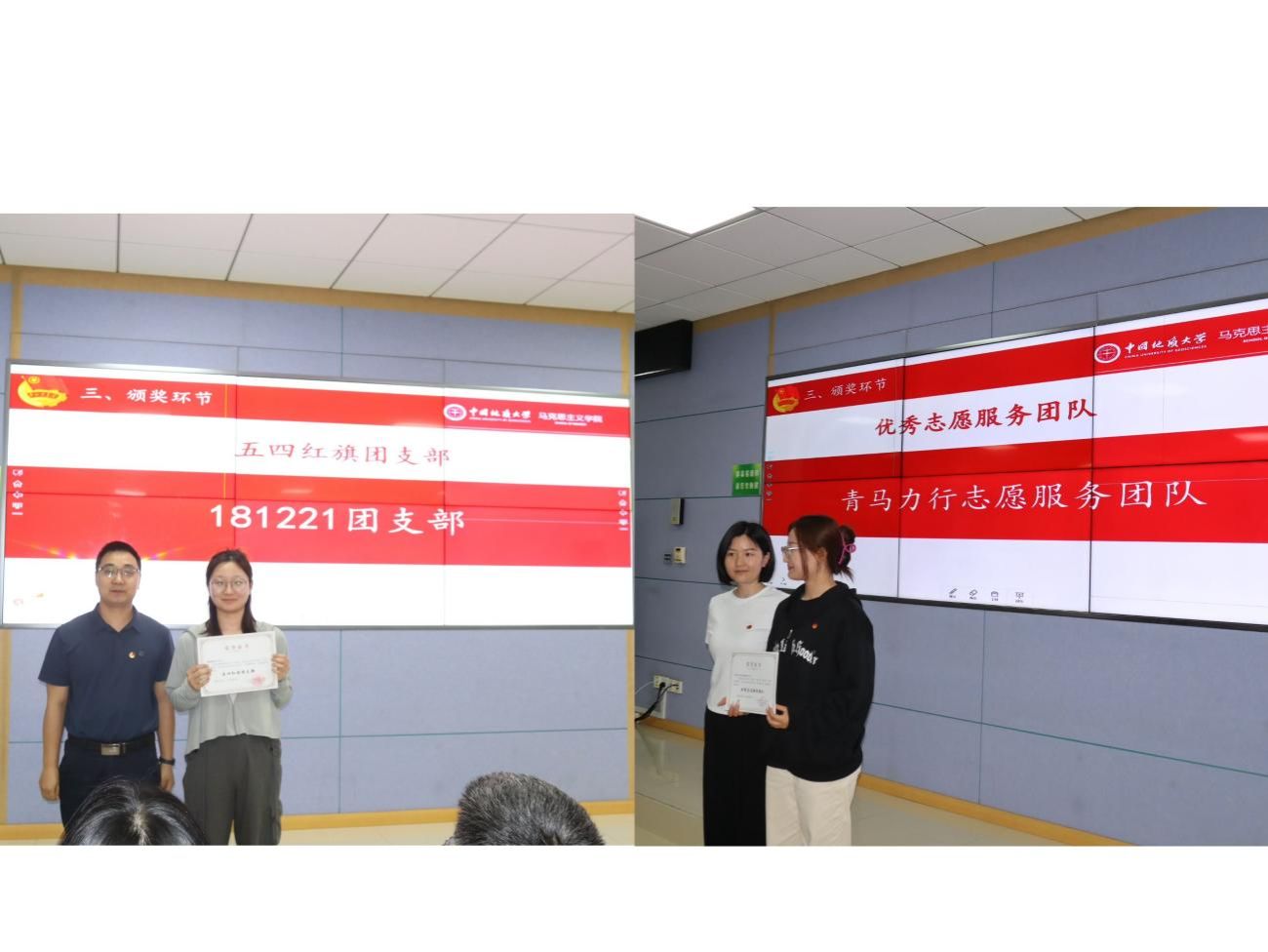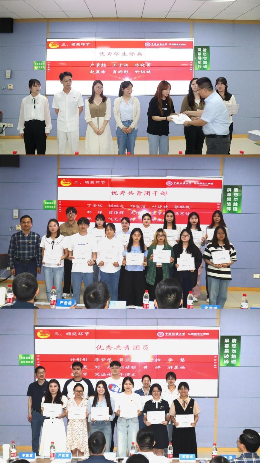 与会领导与老师为五四评优中获奖的集体与个人颁发荣誉证书。