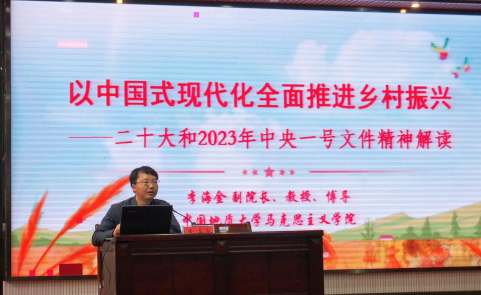 李海金教授来到金铺镇,开展了以“中国式现代化全面推进乡村振兴——党的二十大和2023年中央一号文件精神解读”为题的宣讲,结合全国八个典型案例,重点围绕抓紧抓好粮食和重要农产品稳产保供、巩固拓展脱贫攻坚成果、推动乡村产业高质量发展、扎实推进宜居宜业和美乡村建设等方面进行了深入、细致讲解。与会人员高度肯定本次宣讲的现实意义,认为报告深入浅出、生活鲜活,一致表示将更加自觉地投身于全面建设社会主义现代化国家、全面推进中华民族伟大复兴的伟大实践。