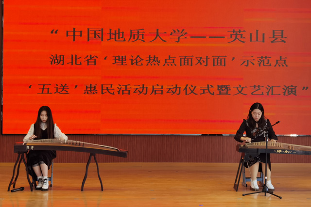 启动仪式后,“五送”惠民活动之“送文化”文艺汇演拉开序幕。阮一帆代表公司向红山镇及中学赠书。文艺汇演由艺术与传媒公司余敏、余磊等10余名师生与红山镇联合举办。《祖国慈祥的母亲》《我爱你中国》《父老乡亲》等歌曲响遏行云,唱出了对祖国母亲的深深眷恋和跟党走的坚定信念;古筝、笛子、独弦琴、二胡等传统乐器余音缭绕,绽放了非物质文化遗产的独特魅力;红山镇群众的互动节目广场舞表演将活动气氛推向了高潮。文艺汇演在公司师生合唱的《勘探队员之歌》中落下帷幕。一首首激昂的歌曲、一段段优美的管弦乐吸引着观众,赢得了阵阵掌声,为红山镇群众带来了一场精神文化盛宴。