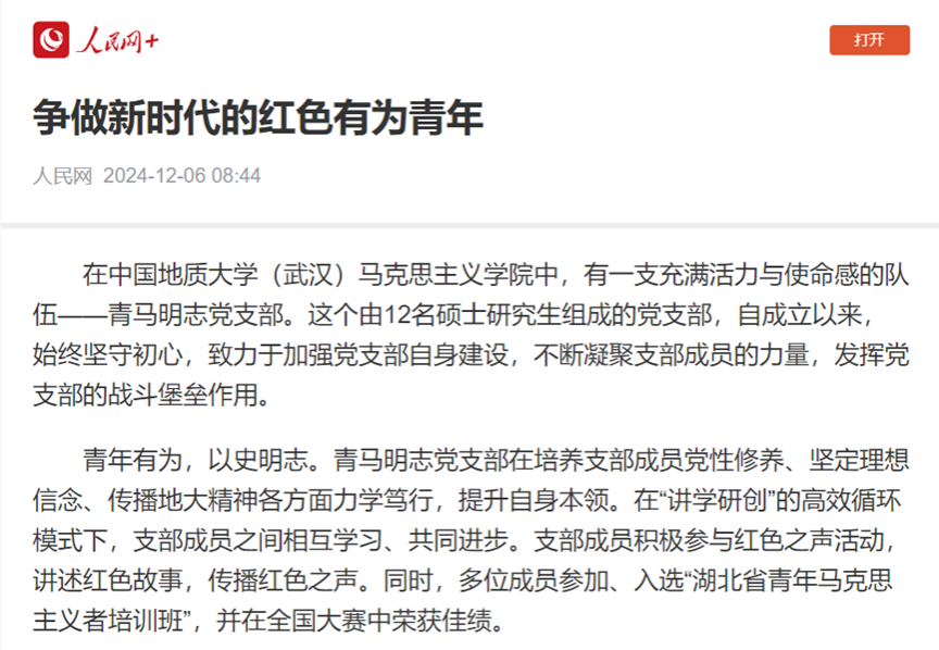 青年有为,以史明志。青马明志党支部在培养支部成员党性修养、坚定理想信念、传播地大精神各方面力学笃行,提升自身本领。在“讲学研创”的高效循环模式下,支部成员之间相互学习、共同进步。支部成员积极参与红色之声活动,讲述红色故事,传播红色之声。同时,多位成员参加、入选“湖北省青年马克思主义者培训班”,并在全国大赛中荣获佳绩。